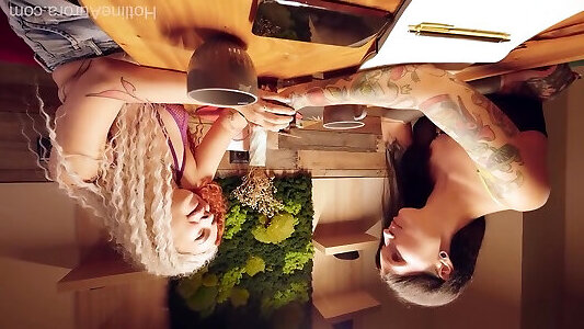 Tatted black-haired damsel sharing some fuck-fest fucktoys with her friend