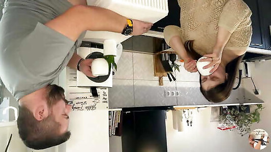 Housewife, plumber and cuckold husband at the kitchen. Scene 1