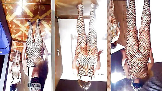 Sexy wife workout at home naked. Sexy brunette tries on pantyhose, hairy pussy, big ass, big tits.