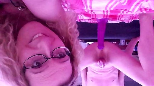 Pink haired Milf goes railing on a giant fake penis in fishnets