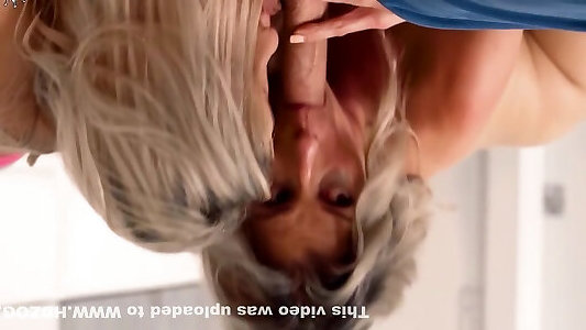 Adorable platinum-blonde in shorts Khloe Kapri drinks a huge pecker and gets her beaver boinked