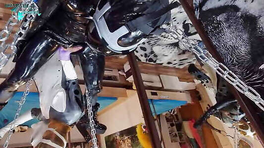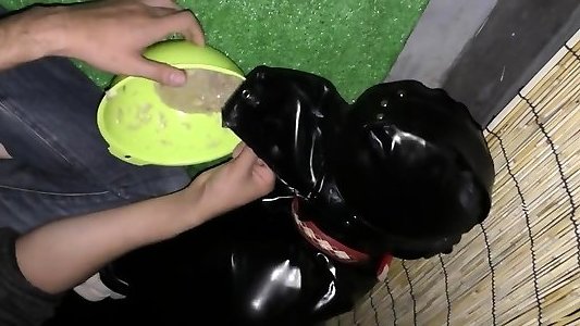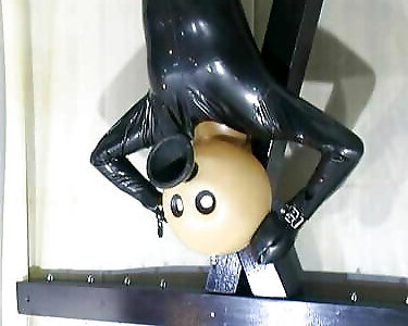 BDSM hardcore latex suit with funnel head