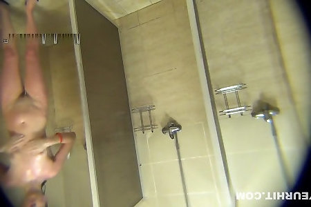 A crimson-haired college girl in the shower does a peeling with babe.