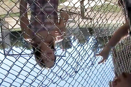 Nice Drilling Outdoors by the Pool of a Sexy Blonde Vixen with Fake Bazongas