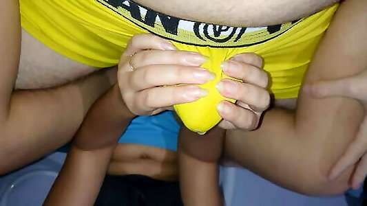 Hand-job thru lingerie, taut trunks, jism in trousers
