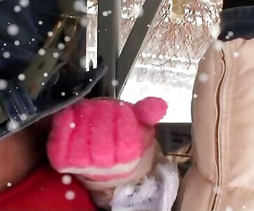 Curly haired ginger dame picked up and fed with cock in the fuck bus