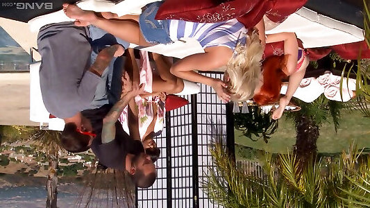 Curvy ebony and blonde whore get their pussy pounded hardcore by a group of studs