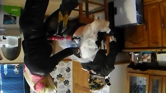 Dark-hued Satin Blouse and Shiny stretch pants Restrain Bondage