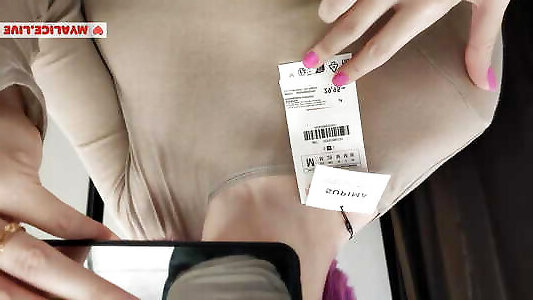 Try on haul sweaters in the fitting room. Big tits beauty pulls on clothes. View during fitting