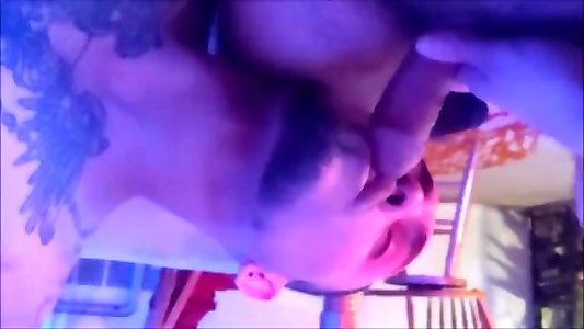 Pixy doll with tats and vibe gives foot restrained gargle job to Bf