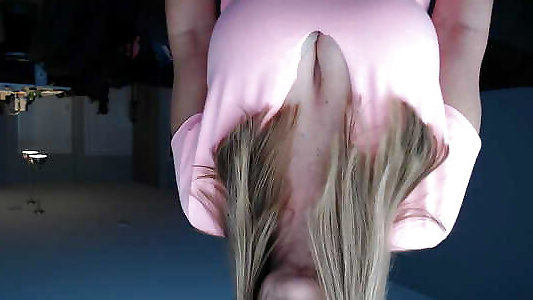 Light-haired stunner performs strip tease in undergarments and pink nylons