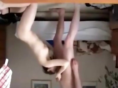 Sexy blonde cleaning bedroom in t shirt without panties. Naked stepdad entered room. Old and young. Family nudism. Taboo Public