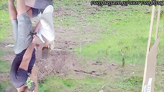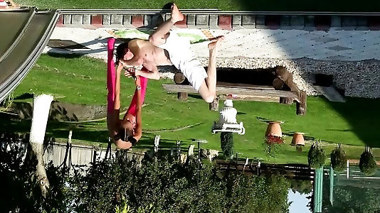 Teenie yoga instructor gives a grubby suck off on the balcony