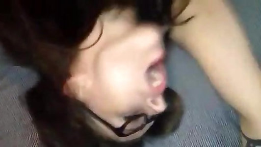dunkel getönte dame wird mit einer milchigen salami in den mund gestopft und gurgelt sie