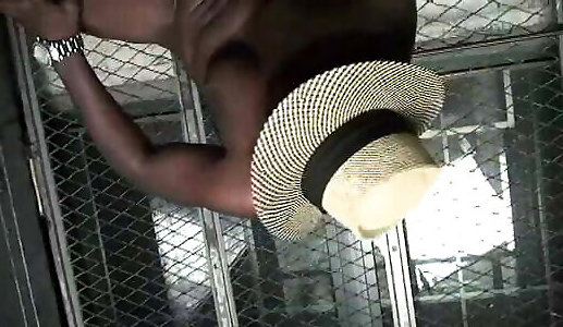 sensuelle brune ravagée par deux grosses bites dans une cage verrouillée