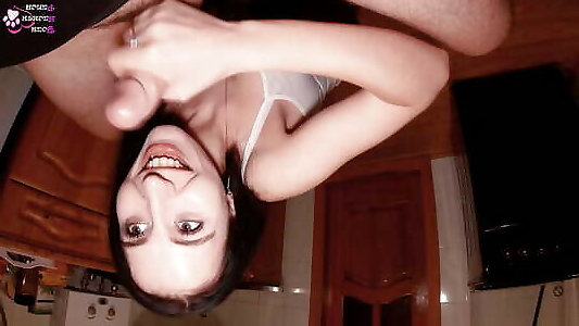 uber-mignonne bite à gorge profonde aux cheveux noirs dans la cuisine