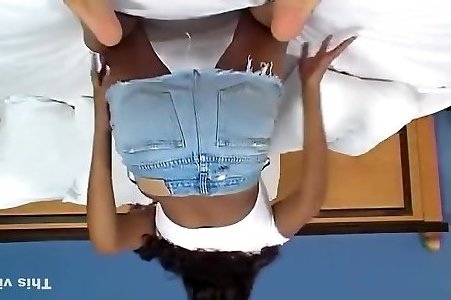 ébène sexy se déshabille avant de sucer sa petite bite blanche