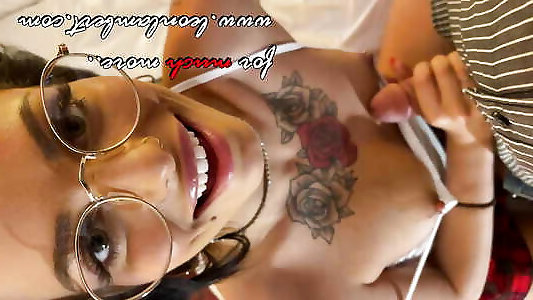 une fille tatouée écarte les jambes pendant que son amant baise sa chatte serrée
