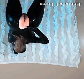 raillerie en latex de clôture totale, lèvres cramoisies, remuant, cul bouché