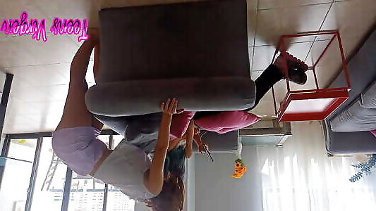 un couple a des relations sexuelles à travers des pantalons stretch, des rapports sexuels inexpérimentés