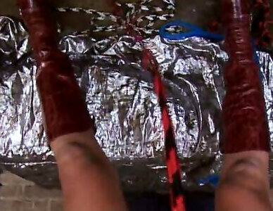 les jambes de la victime évasées puis pénétrées avec un jouet ultra-mignon dans la domination et la soumission