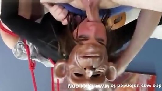 une demoiselle noire obéissante à capuche est attachée et souffle un énorme salami