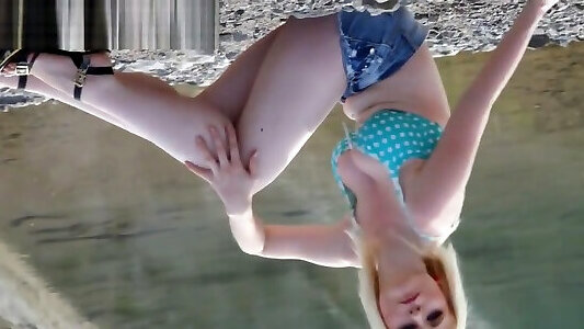 buxom aux cheveux clairs montre sa silhouette près du lac