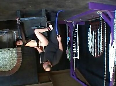 complètement courbée vers larrière, son cou attaché pour quelle ne puisse pas bouger, son visage cruellement désossé en jizz-attaché comme un porc