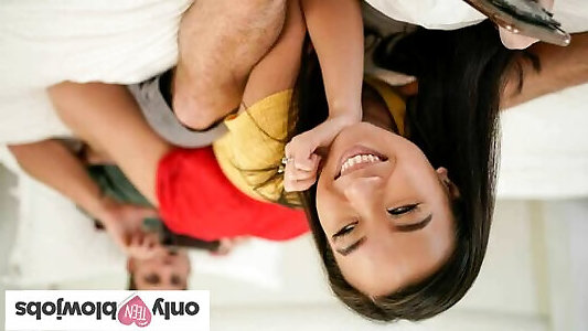 brunette gags sur la bite de son pote et se fait éjaculer sur son torse