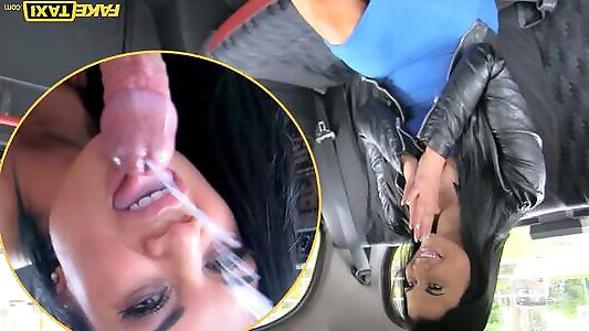 faux taxi - la fille en robe bleue-une brune excitée des années 30 aux gros seins éjacule sur la bite des chauffeurs de taxi