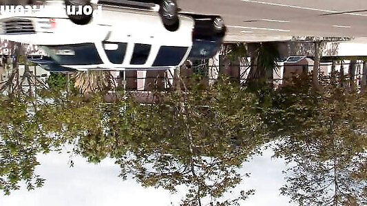 une milf sexy sans culotte et sans soutien-gorge apprend à conduire une voiture avec son instructeur. en public. seins naturels milf