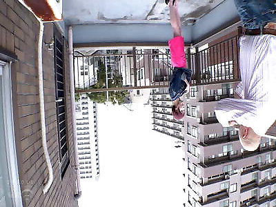 vividredhead aux seins énormes se fait sans soutien-gorge sur la terrasse du penthouse