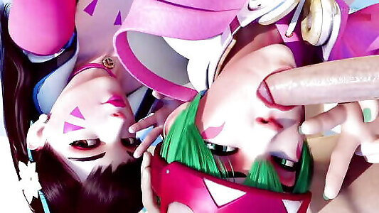 de beaux cheveux bouclés sucent deux grosses bites