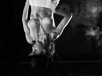 ann denise, très torride, taquine la bande en tenue de gimp aux teintes foncées