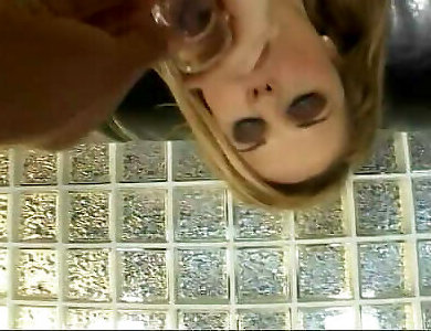 une jolie adolescente blonde aux énormes seins se fait tirer une giclée de sperme dans les yeux