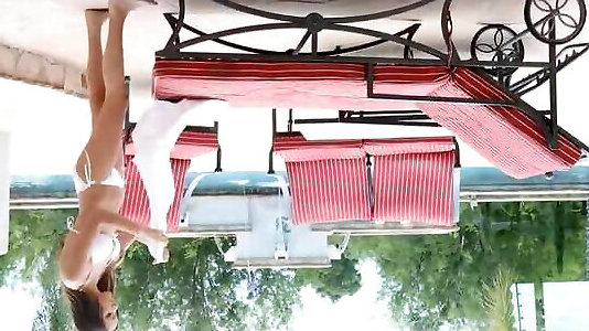 la jolie sandy blonde platine joue avec sa chatte super mignonne au bord de la piscine