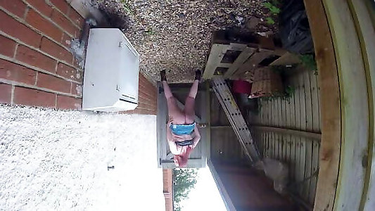 femme courbée en micro-jupe en jean clignotant dans la cour