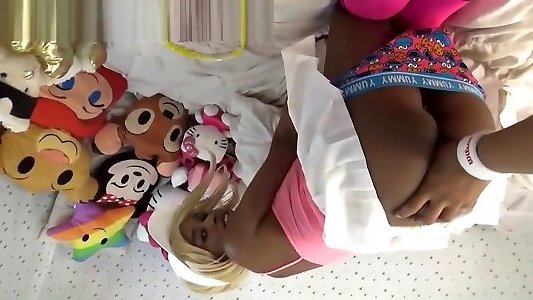 en train de peloter une poupée dodue avec un jouet accroché dans le dos