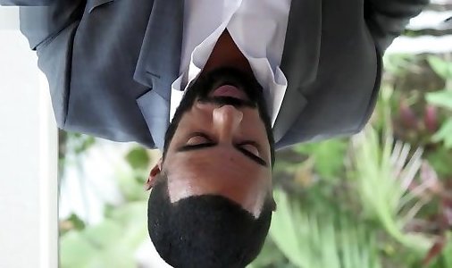 une milf aux cheveux noirs à la mode fait une pipe géniale et baise un mec noir suspendu