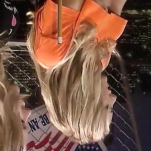 une blonde platine brûlante avec de gros melons dodus chevauche le poteau de boy&039;s comme un professionnel