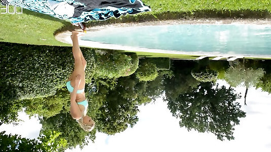 bleu témoin de blonde en maillot de bain déballe près de la piscine