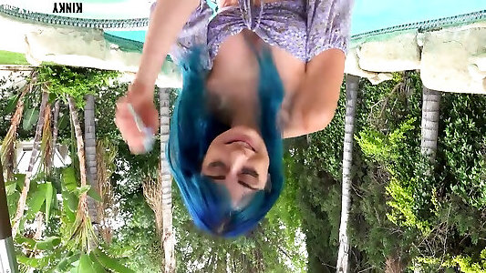 nymphe aux cheveux bleus dansant et se masturbant sur le balcon
