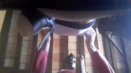 laura sur des chaussures à talons hauts 2021, attachée sur la table et déchirée