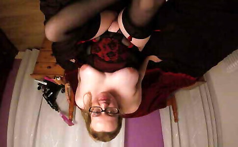 femme en lingerie sexy en dentelle rouge avec de gros seins et vibromasseur sur cam