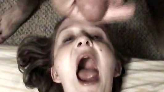 une adolescente blonde de 18 ans avec de petits seins se fait tirer dessus dans la gorge après une orgie en van