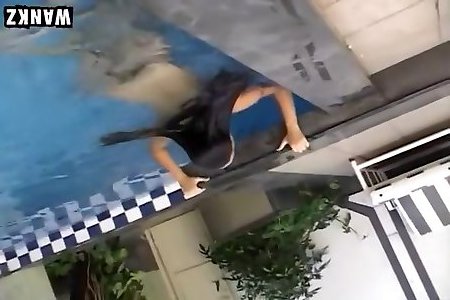 mince petite fille en ébène jugé branle à côté de la piscine