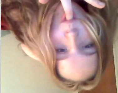 une jolie adolescente blonde joufflue aux yeux bleus joue avec son manchon non rasé sur webcam pour moi