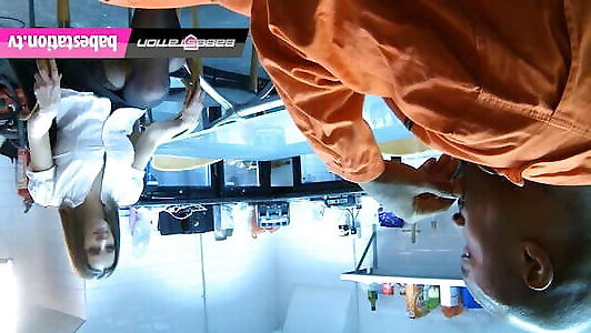 bbw fille potelée nettoyage des étagères en short blanc serré