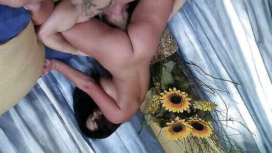 la merveilleuse brune aux cheveux noirs prend deux bites charnues dans ses crevasses humides