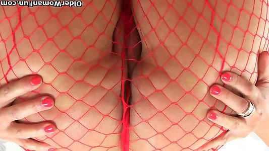 la milf chaude mariaold taquine par dénormes seins, portant des bas noirs et des chaussures à talons hauts